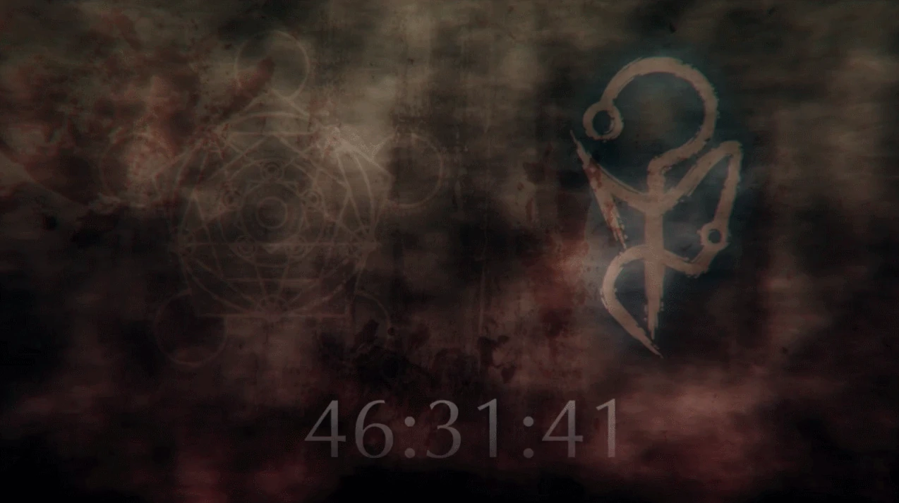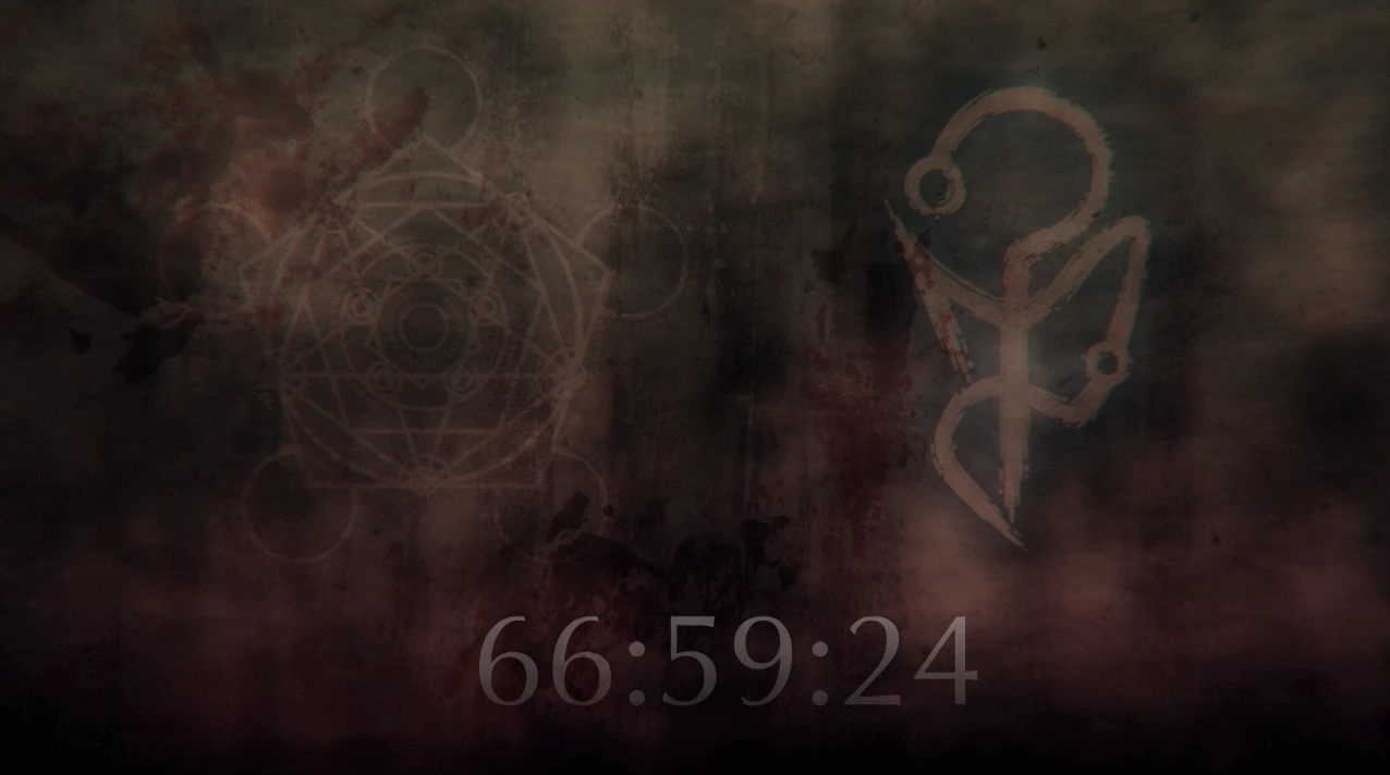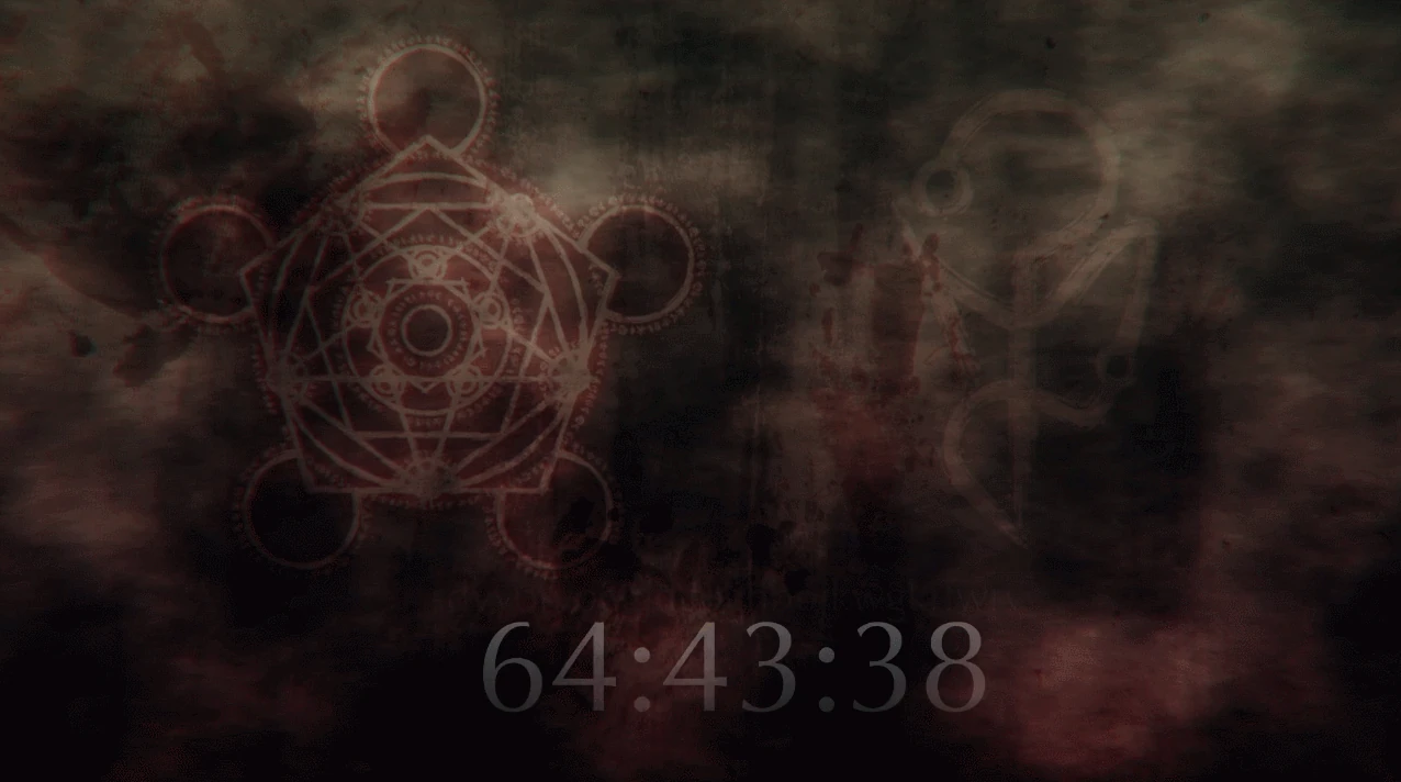 Com 23:48:25 faltando, o símbolo vermelho brilha mais uma vez, e a tela se enche de inúmeros símbolos ocultistas, do mesmo alfabeto que utilizamos no coliseu.
