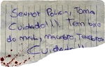 Página rasgada do diário de Jorge Lagos, mencionando cachorros do mal e um desenho do ônibus que ele estava tendo um pneu perfurado por um "X" com instruções para o Delegado Aguiar, escrito por Jorge Lagos. Deixado na porta da geladeira da cozinha.[5] |