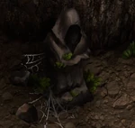 Estátua antiga de uma pessoa encapuzada. Foi encontrada na entrada da caverna em meio as vegetações próximas da praia de Tipora.[10] |